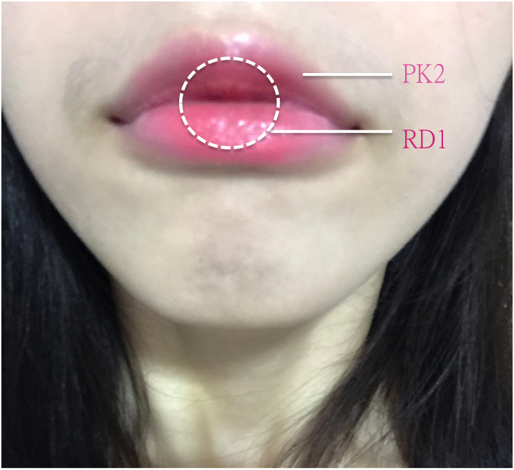 先使用PK2塗勻整個嘴脣 中間的部分用RD1點綴