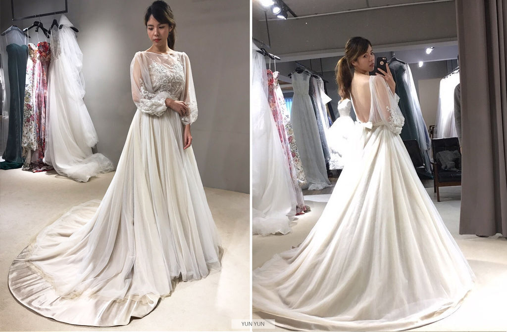 白4:這件也是挑選時一眼就喜歡的!不得不說emma的設計款真的很特別,水袖也超級美的,如果想要找特殊一點有點個性的拍照款白紗 這件超適合!