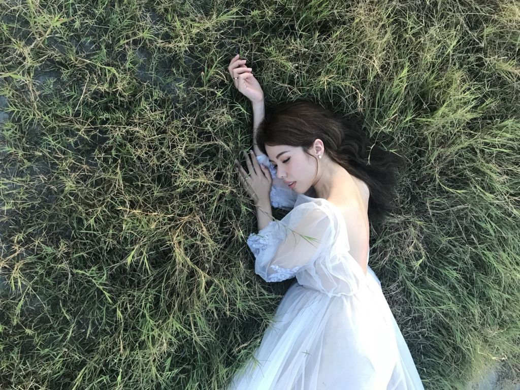 白7: 常見的背心款的白紗,做了一些拼接蕾絲和摟空的造型變化,變得比較不古板有趣,覺得這件草地外拍很適合